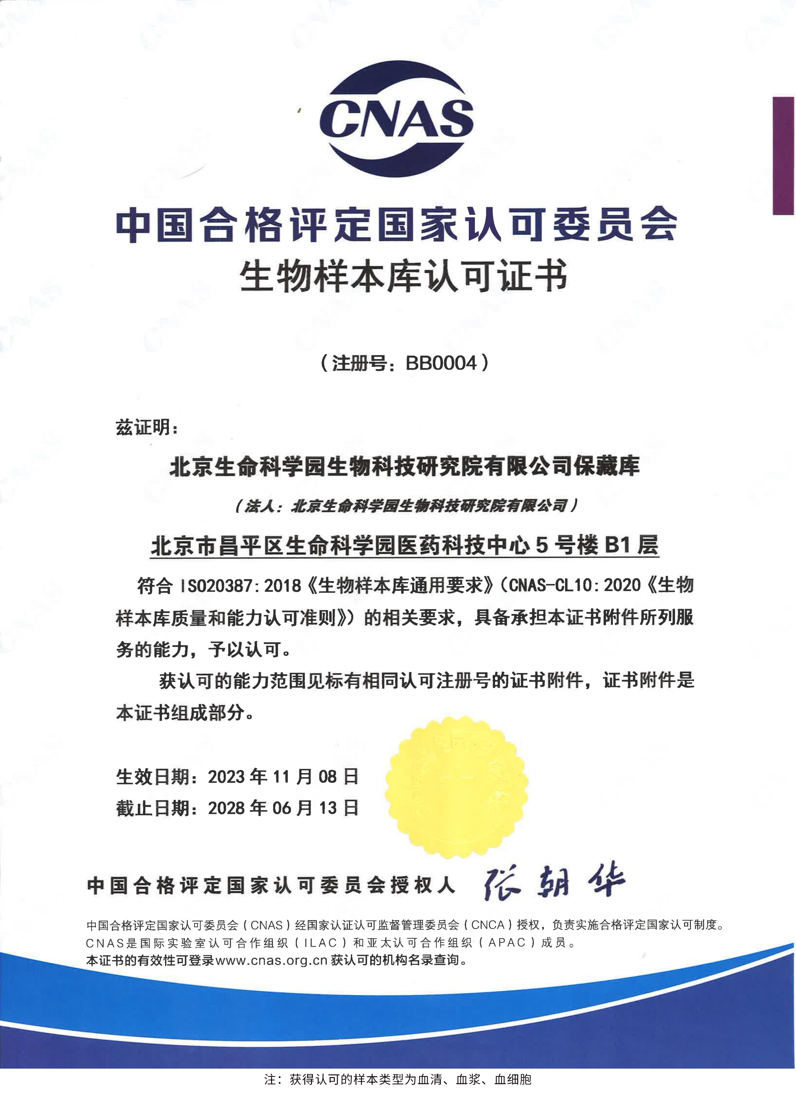 北京生命科學(xué)園生物科技研究院(以下簡(jiǎn)稱(chēng)“北京生物樣本資源庫(kù)”)(Biobank of Life Science Park,簡(jiǎn)寫(xiě)“BoLSP”)是一家由北京市科委和中關(guān)村生命科學(xué)園共同支持設(shè)立的第三方生物樣本庫(kù)公共服務(wù)平臺(tái),秉承北京重大疾病臨床數(shù)據(jù)和樣本資源庫(kù)(以下簡(jiǎn)稱(chēng)“北京庫(kù)”)(Beijing Biobank of Clinical Resources,BBCR)十余年的發(fā)展成果,聚合眾多臨床樣本專(zhuān)家的專(zhuān)業(yè)共識(shí),致力于在生命科學(xué)、生物醫(yī)藥研究領(lǐng)域發(fā)揮銜接樣本資源持有者與研究者的橋梁作用,解決生物樣本資源開(kāi)發(fā)上下游信息不對(duì)稱(chēng)、資源共享困難等問(wèn)題。研究院在北京中關(guān)村生命科學(xué)園昌平園區(qū)建立了2000㎡生物樣本庫(kù),最大存儲(chǔ)規(guī)模達(dá)1000萬(wàn)份。研究院遵循CNAS-CL10:2020《生物樣本庫(kù)質(zhì)量和能力認(rèn)可準(zhǔn)則》,同時(shí)結(jié)合北京庫(kù)過(guò)去十年的工作經(jīng)驗(yàn)與教訓(xùn),建立了一套完善的生物樣本保藏質(zhì)量管理體系,從人、機(jī)、料、法、環(huán)、控多個(gè)角度,實(shí)現(xiàn)生物樣本保藏過(guò)程的全面質(zhì)量控制,先后獲得國(guó)家科技部頒發(fā)的人類(lèi)遺傳資源保藏行政許可證書(shū)和中國(guó)合格評(píng)定國(guó)家認(rèn)可委員會(huì)(China National Accreditation Service for Conformity Assessment,CNAS)頒發(fā)的“CNAS認(rèn)可證書(shū)”。
